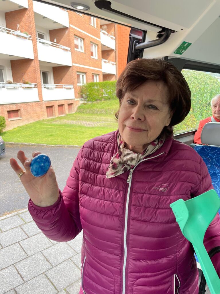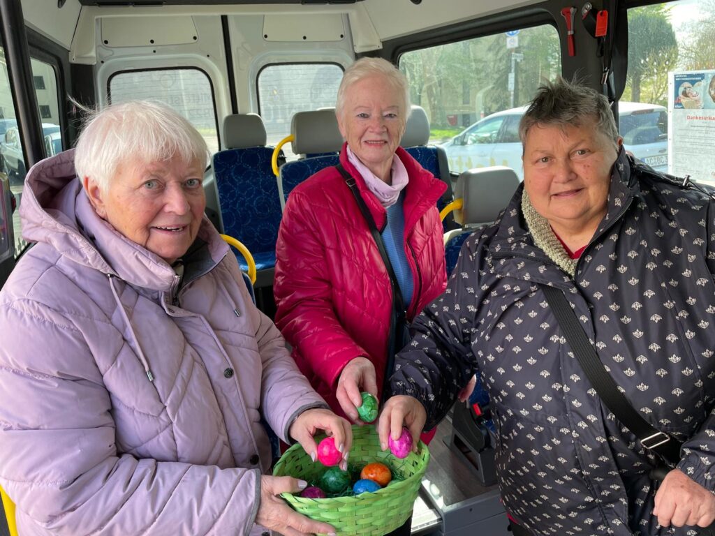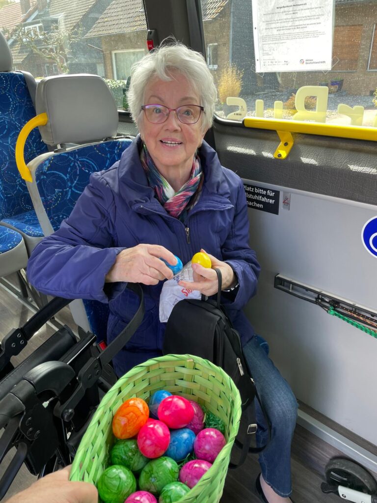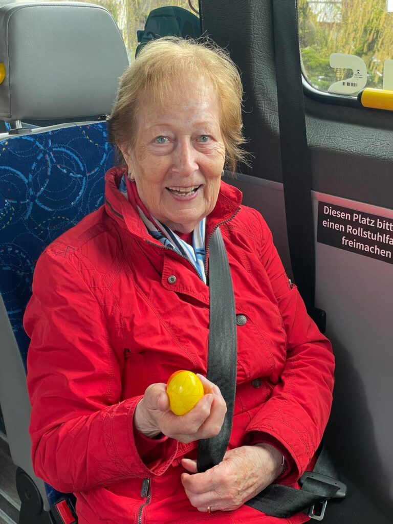 Seit dem Start des BürgerBusses in 2023, fährt sie regelmäßig, 2-3 mal in der Woche in die Stadt zum Einkaufen. Eine Stammkundin und überzeugte Nutzerin unseres Beförderungsangebotes.